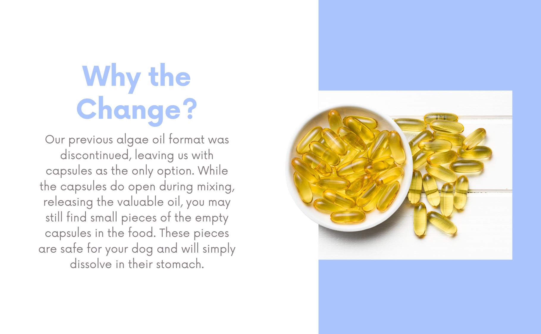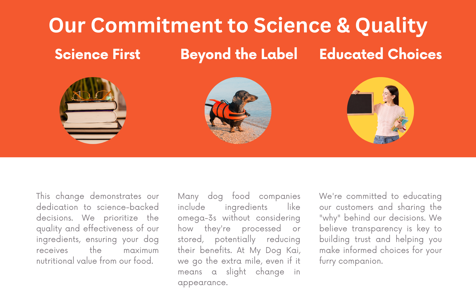 My Dog Kai's Pork formula may contain small pieces of gelatin capsules. These are remnants of capsules that held omega-3 rich algae oil, essential for your dog's health. We prioritize science-backed choices to optimize your dog's nutrition, even if it means a slight change in the food's appearance.